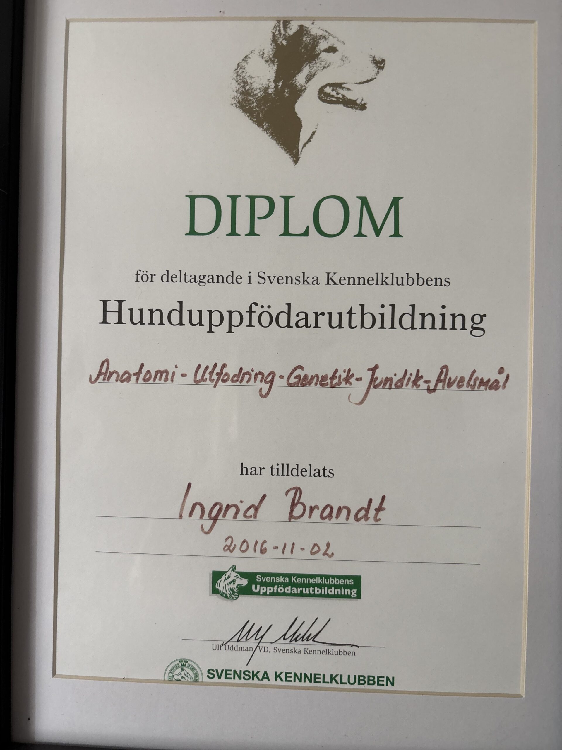 Genomgått Svenska Kennelklubbens uppfödarutbildning med fokus på anatomi, utfodring, genetik, juridik och avelsmål